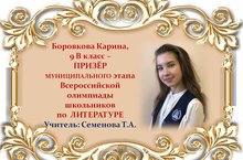 Поздравляем Карину Боровкову и её учителя Татьяну Анатольевну Семенову с ПРИЗОВЫМ МЕСТОМ в муниципальном этапе Всероссийской олимпиады школьников по ЛИТЕРАТУРЕ среди учащихся 9 классов и желаем им новых ПОБЕД! Молодцы!!!