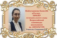 Поздравляем Камиллу Шайхутдинову и её учителя Татьяну Анатольевну Семенову с ПРИЗОВЫМ МЕСТОМ в муниципальном этапе Всероссийской олимпиады школьников по ЛИТЕРАТУРЕ среди учащихся 9 классов и желаем им новых ПОБЕД! Молодцы!!!