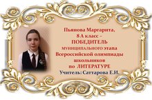 Поздравляем Маргариту Пьянову и её учителя Елену Ивановну Саттарову с ПОБЕДОЙ в муниципальном этапе Всероссийской олимпиады школьников по ЛИТЕРАТУРЕ среди учащихся 8 классов и желаем им новых ПОБЕД! Молодцы!!!