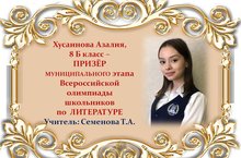 Поздравляем Азалию Хусаинову и её учителя Татьяну Анатольевну Семенову с ПРИЗОВЫМ МЕСТОМ в муниципальном этапе Всероссийской олимпиады школьников по ЛИТЕРАТУРЕ среди учащихся 8 классов и желаем им новых ПОБЕД! Молодцы!!!