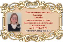 Поздравляем Ангелину Решетникову и её учителя Елену Ивановну Саттарову с ПРИЗОВЫМ МЕСТОМ в муниципальном этапе Всероссийской олимпиады школьников по ЛИТЕРАТУРЕ среди учащихся 8 классов и желаем им новых ПОБЕД! Молодцы!!!
