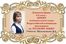Поздравляем Алину Давыдову и её учителя Веру Александровну Малолеткову с ПРИЗОВЫМ МЕСТОМ в муниципальном этапе Всероссийской олимпиады школьников по РУССКОМУ ЯЗЫКУ среди учащихся 6 классов и желаем им новых ПОБЕД! Молодцы!!!