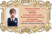 Поздравляем Сергея Цыганова и его учителя Веру Александровну Малолеткову с ПРИЗОВЫМ МЕСТОМ в муниципальном этапе Всероссийской олимпиады школьников по РУССКОМУ ЯЗЫКУ среди учащихся 6 классов и желаем им новых ПОБЕД! Молодцы!!!