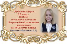 Поздравляем Дарью Дубровину и её учителя Данию Дамировну Абдуллину с ПРИЗОВЫМ МЕСТОМ в муниципальном этапе Всероссийской олимпиады школьников по РУССКОМУ ЯЗЫКУ среди учащихся 6 классов и желаем им новых ПОБЕД! Молодцы!!!