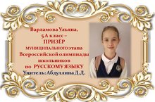 Поздравляем Ульяну Варламову и её учителя Данию Дамировну Абдуллину с ПРИЗОВЫМ МЕСТОМ в муниципальном этапе Всероссийской олимпиады школьников по РУССКОМУ ЯЗЫКУ среди учащихся 5 классов и желаем им новых ПОБЕД! Молодцы!!!