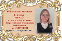 Поздравляем Ангелину Решетникову и её учителя Марину Сергеевну Хуснуллину с ПРИЗОВЫМ МЕСТОМ в муниципальном этапе Всероссийской олимпиады школьников по ЭКОЛОГИИ среди учащихся 8 классов и желаем им новых ПОБЕД! Молодцы!!!