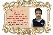 Гусейнов Нурлан, ученик 7 Б класса, стал ПОБЕДИТЕЛЕМ муниципального этапа Всероссийской олимпиады школьников по ТУРЕЦКОМУ ЯЗЫКУ (учитель: Абдуллина Д.Д.)! Поздравляем и желаем новых побед!!!
