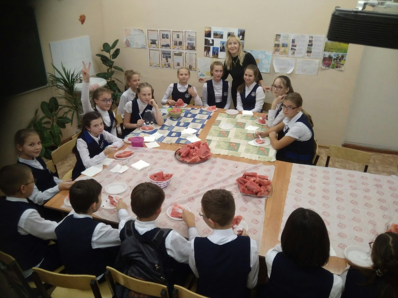 На улице холодно, сыро, уныло. А у нас в лицее весёлые и вкусные сюрпризы! Ученики 6Б и 7А классов со своим классным руководителем Абдуллиной Д.Д. провели замечательный осенний праздник - «Арбузник». Дети узнали много нового об арбузе, играли в интересные игры, участвовали в конкурсах, сочиняли стихи об этой ягоде. А в конце мероприятия неожиданно появился на столе и сам виновник торжества – большой сладкий арбуз. Праздник удался!