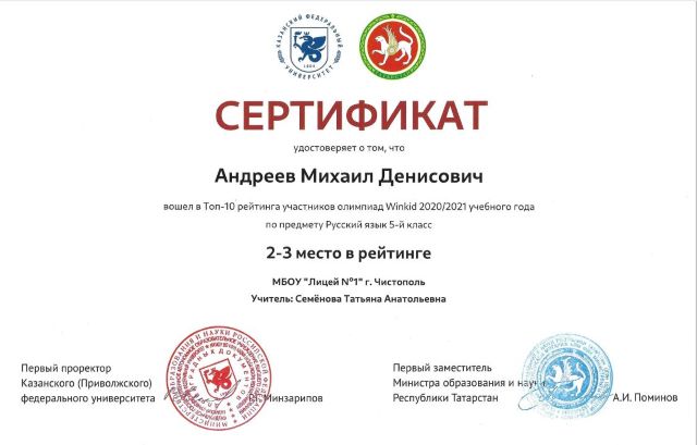 Опубликовано: 02.10.202130 сентября в "Униксе" (КФУ) состоялось чествование лучших учеников Республики Татарстан по итогам предметных олимпиад "Winkid" за 2020/2021 учебный год. Поздравляем Михаила Андреева, ученика 6 Б класса, с итоговым ВТОРЫМ-ТРЕТЬИМ местом по РУССКОМУ ЯЗЫКУ (5 олимпиад в течение учебного года с победами!) ! Молодчина, Миша!