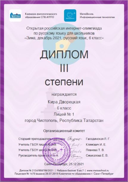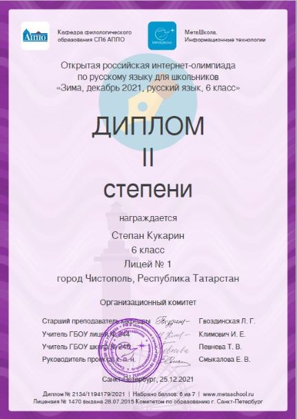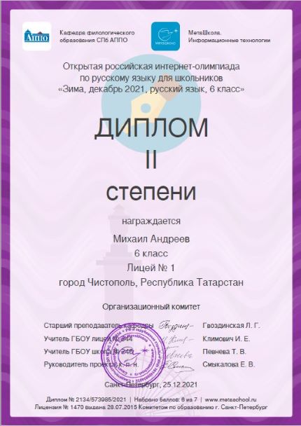 Опубликовано: 26.12.2021Учащиеся 6 Б класса - призёры Всероссийской зимней интернет-олимпиады "МетаШколы" по русскому языку! Молодцы!