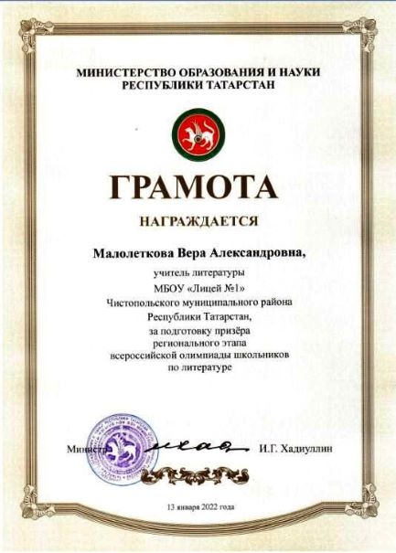 Опубликовано: 17.01.2022Арина - республиканский призёр по литературе! Поздравляем с ПРИЗОВЫМ МЕСТОМ на региональном этапе Всероссийской олимпиады школьников по ЛИТЕРАТУРЕ ученицу 11 класса Штанову Арину и её учителя Малолеткову Веру Александровну! Новых вам побед! Молодцы!!!