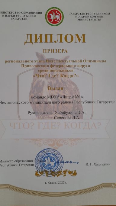 Опубликовано: 26.02.2022Поздравляем команду " МБОУ Лицей 1" , призера регионального этапа Интеллектуальной олимпиады Приволжского федерального округа среди школьников " Что? Где? Когда ? " ( руководитель Хабибулина Э.А., Семенова Л.А.)Молодцы ! Желаем дальнейших побед и достижений!