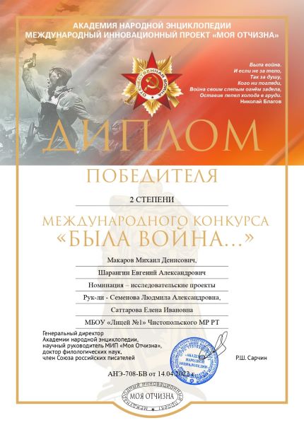 Опубликовано: 27.04.2022Поздравляем Макарова Михаила, Шарангина Евгения и их руководителей Саттарову Е.И., Семенову Л.А. с победой в Международном конкурсе "Была война...", посвященном 77-й годовщине Великой Победы!