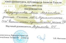 Поздравляем нашу ученицу Хайрутдинову А. - обладателя Диплома 3 степени Республиканской НПК "Чтения Ахмета Гаделя" .