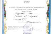 Ученица 6 класса Абдуллина Дина стала призером на муниципальном конкурсе чтецов, посвященного творчеству известной поэтессы Ф. Тархановой. Молодец!