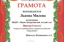 Наша воспитанница Львова М. приняла участие в открытом муниципальном турнире способностей "SuperДетки" и заняла 3 место.