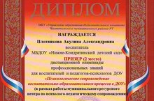 Воспитатель Плотникова А. А. стала призером (2 место) дистанционной олимпиады профессиональных знаний для воспитателей и педагогов - психологов ДОУ "Психологическое сопровождение воспитательного образовательного процесса в ДОУ" (в рамках работы муниципального ресурсного центра по психолого-педагогическому сопровождению).