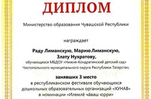 Наши воспитанники заняли 3место в республиканском фестивале обучающихся дошкольных образовательных учреждений "Хунав" в номинации "Илемле чаваш юрри".