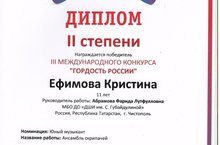 Поздравляем преподавателя по классу скрипки Абрамову Ф.Л. с победой в III международном конкурсе "Гордость России". Фарида Лутфулловна с ученицей 5 класса Ефимовой Кристиной участвовала в Международном конкурсе "Гордость России" в номинации "Юный музыкант".