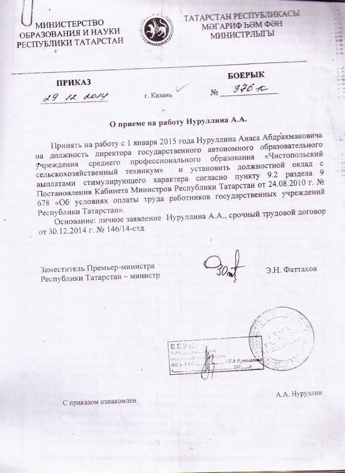 Приказ о назначении директора ГАПОУ "Чистопольский сельскохозяйственный техникум имени Г.И. Усманова"