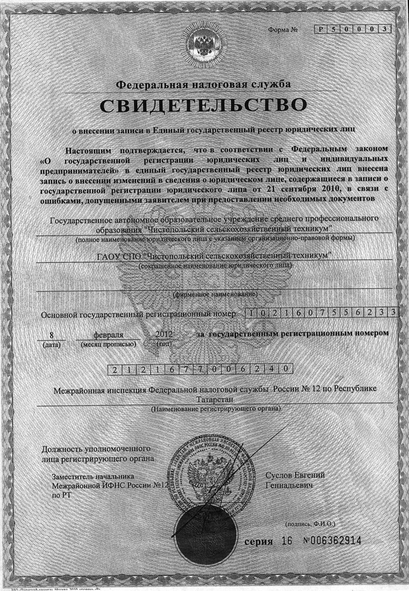 Устав ГАПОУ «Чистопольский сельскохозяйственный техникум им. Г.И.Усманова»