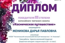 Студентка 112 группы Женихова Дарья стала победителем Всероссийского творческого конкурса "Космическое путешествие"