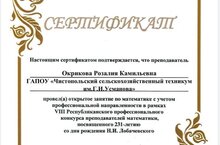 На базе государственного автономного профессионального образовательного учреждения «Камский строительный колледж имени Е.Н. Батенчука» прошёл второй этап VIII Республиканского профессионального конкурса преподавателей математики, посвященный 231-летию со дня рождения Н.И. Лобачевского, где преподаватель нашего техникума Окрикова Р.К стала победителем и заняла 3 место. Так же в рамках этого конкурса Розалия Камильевна провела открытое занятие по математике с учетом профессиональной направленности.