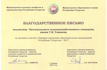 За активное участие в Ярмарке продукции образовательных организаций Республики Татарстан - 2017 коллектив техникума награжден Благодарственным письмом министерства сельского хозяйства и продовольствия РТ и министерства образования и науки РТ.