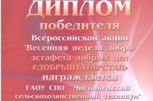 27 апреля 2015г. в Скарятинском парке состоялся «Марш добра». В рамках «Весенняя неделя добра» с 20.04. по 25.04 прошли мероприятия, в ходе которых добровольцы были вовлечены в благотворительную деятельность. В данной акции приняли участие и студенты нашего техникума, участвовали в флеш-мобе в Скарятинском парке. Наш добровольческий отряд «Добрые сердца» стал победителем в номинации «В память о Победе». Молодцы!