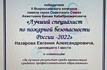 Назаров Евгений Александрович, заместитель директора по обеспечению пожарной безопасности 22 апреля 2022 года принял участие в II Всероссийском конкурсе памяти героя Советского Союза Ахметшина Каюма Хабибрахмановича «Лучший специалист по пожарной безопасности России – 2022», посвященный 95-летию с момента образования Государственного пожарного надзора.