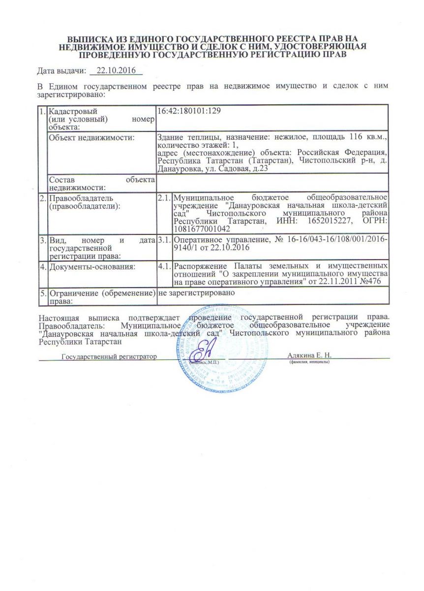 Выписка из Единого государственного реестра прав на недвижимое имущество (здание теплицы)