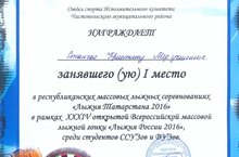 13 февраля, в рамках 34 открытой Всероссийской лыжной гонки «Лыжня России 2016», команда Чистопольского медицинского училища приняла активное участие в забеге. По результатам гонки студентка первого курса Станчас Кристина стала абсолютным победителем, заняла 1 призовое место! Поздравляем Кристину и желаем дальнейших побед!!!