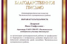 5 февраля 2016г. на заседании Антитеррористической комиссии Чистопольского муниципального района Лазарева Наиля Сайфулловна, директор ГАОУ СПО РТ «Чистопольское медицинское училище (техникум)» была удостоена Благодарственного письма Главы Чистопольского муниципального района за организацию целенаправленной работы по профилактике терроризма и экстремизма, развитие творческой созидательной активности среди молодёжи Чистопольского муниципального района.