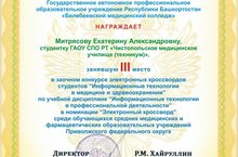 Подведены итоги заочного конкурса электронных кроссвордов студентов "Информационные технологии в медицине и здравоохранении" по учебной дисциплине "Информационные технологии в профессиональной деятельности" среди студентов медицинских и фармацевтических образовательных учреждений Приволжского федерального округа. Студентка 4 курса Митрясова Екатерина заняла 3 призовое место в номинации "Электронный кроссворд". Поздравляем победительницу!