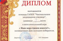 Традиционно каждый год в Чистополе проводится брейн-ринг, посвященный Дню молодого избирателя. В этом году он прошел под названием "Наш мир строим вместе!". Команда из шести студентов Чистопольского медицинского училища достойно показала себя и заняла первое место.