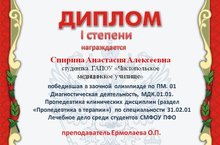 Студентка Чистопольского медицинского училища Спирина Анастасия показала свои знания в прошедшей заочной олимпиаде по ПМ.01 Диагностическая деятельность, МДК.01.01 Пропедевтика клинических дисциплин (раздел "Пропедевтика в терапии") по специальности 31.02.01 Лечебное дело среди студентов средних профессиональных медицинских образовательных учреждений и заняла первое место.