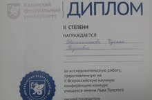 2 декабря 2021 года во II очном туре V Всероссийской научной конференции имени Л. Толстого Шагиахметова Ч., учащаяся МБОУ «Лицей № 1» (руководитель - Семенова Т.А., учитель русского языка и литературы МБОУ «Лицей № 1») награждена дипломом II степени. Поздравляем и желаем дальнейших успехов!