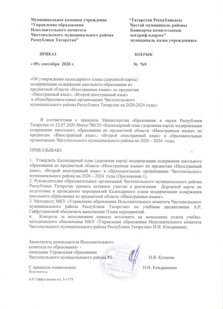 Приказ об утверждении плана (дорожной карты) модернизации содержания школьного образования из предметной области «Иностранные языки» по предметам «Иностранный язык», «Второй иностранный язык» в образовательных организациях Чистопольского муниципального района на 2020 – 2024 годы.