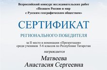 Матвеева А.С. II место в номинации "Презентация" среди учеников 5-6 классов по Республике Татарстан