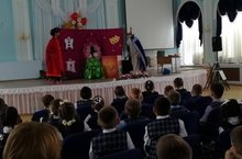 Артисты выездного театра "Весёлый дени" с первых минут вовлекли ребят в весёлую сказку " Вовка в тридевятом царстве". Ребята с интересом следили за героями, вместе с ними веселились! Буря аплодисментов и улыбок лучшая награда для артистов театра! Спектакль всем очень понравился!