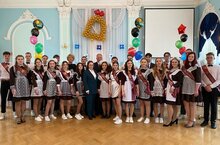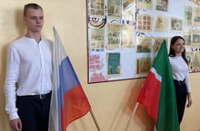 В школе подняли два флага: Государственный флаг Российской Федерации и государственный флаг Республики Татарстан с озвучиванием мелодий гимнов России и Татарстана.
