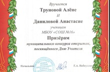 Поздравляем Трунову Алену и Данилову Анастасию, ставшими Призерами муниципального конкурса открыток, посвященного Дню учителя.