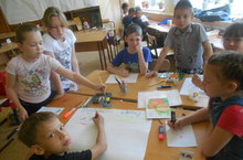 После вкусного завтрака ребята разошлись по отрядным комнатам. В этот день проходил конкурс «День мастеров». Дети создавали своими руками отрядную газету ,придумывали необычные украшения к ней. В этом конкурсе ни один ребенок не оставался без дела.После конкурса все ребята лагеря играли на школьной спортивной площадке. Кто предпочитал покататься на качелях, мальчики поиграли в футбол между отрядами, кто-то просто полазал на спортивных снарядах.