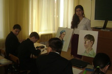 Акишина Алина проходя педагогическую практику в родной школе, провела уроки у 6-х классов. В 6 "А" тема урока: "Портрет в ИЗО искусстве", студентка учила учеников правельному построению лица. В 6 "Б" тема урока: "Мезенская роспись", Алина познакомила учеников с росписью.