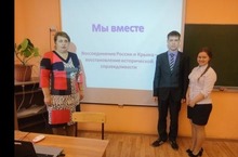 30 мая 2014г в 9а классе был проведен парламентский урок «Мы вместе». Урок был посвящен теме интеграции России, Республики Крым и города Севастополя. Цель урока: разъяснение исторического значения, оснований воссоединения России и Крыма. Учащиеся ознакомились с кратким историческим экскурсом Крыма.