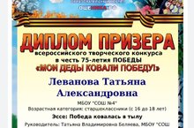 Поздравляем Леванову Татьяну, призера всероссийского творческого конкурса "Мои деды ковали победу!" в номинации эссе.