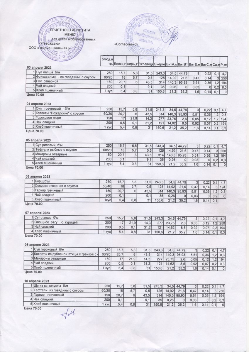 Завтрак 1-4 классы Для детей мобилизованных (контракт) 11-18 лет Для детей мобилизованных (договор) 1-4 классы (доп. питание)