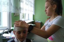 Отряд ЮИД готовится к конкурсу "Безопасное колесо". Ребята учатся оказывать первую помощь пострадавшему.