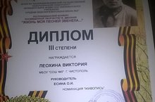 “Минем гомерем җыр белән үтте...” исемендә Муса Җәлил иҗатына багышланган республика конкурсында 2 “Д” сыйныфы укучысы Леохина В (җитәкчесе Есина О.И.) 3 дәрәҗәле диплом белән бүләкләнде. Котлыйбыз!