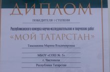 Поздравляем победителя инновационного проекта , дипломанта 1 степени Республиканского конкурса научно-исследовательских и творческих работ "Мой Татарстан", Тимошкину М.В.